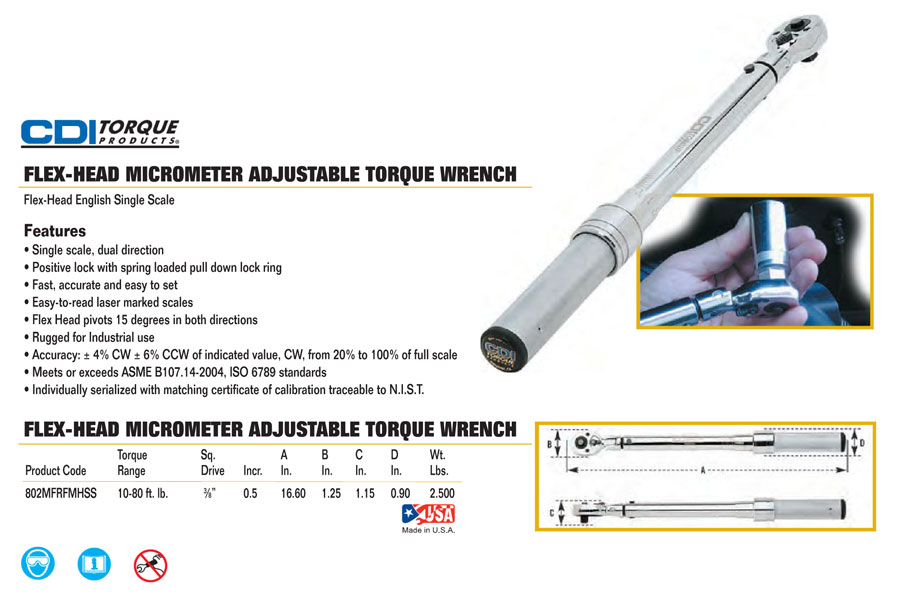 Micrometer Torque Wrench, Flex Head Ratcheting ade in the USA - Quality and AvailabilityM Head Flexes Up to 15 Degrees for Access Includes Certification. Certification is the Documentation of the Actual Calibration of the Torque Wrench to Include; Model ... Content Retrieval